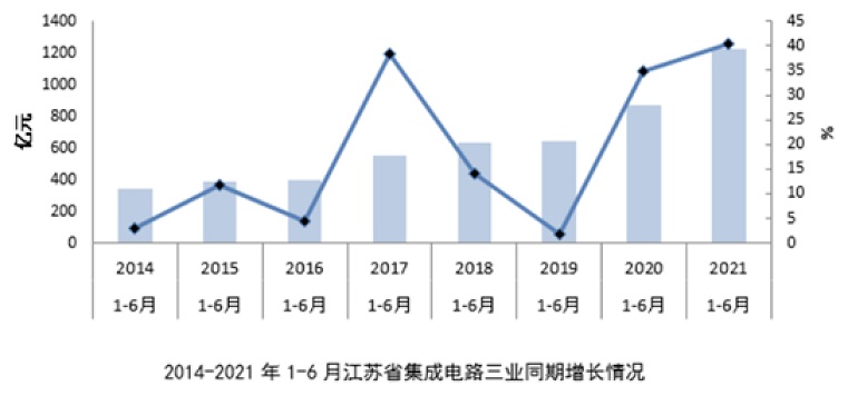 9月9日,江蘇半導體協會發布了2021年上半年江蘇省半導體產業發展運行情況。 2021年上半年,江蘇省集成電路產業銷售總收入為1540.63億元,同比增長37.05%。其中,集成電路主業銷售收入達1222.89億元,同比增長40.35%;集成電路支撐服務業銷售收入為317.74億元,同比增長25.68%。 從集成電路三業細分數據來看,集成電路設計業銷售收入同比增長158.62%;集成電路晶圓業銷售收入增長20.12%;集成電路封測業銷售收入同比增長22.56%。 2021年上半年,江蘇省分立器件銷售收入(包含在晶圓業和封測業數據中)同比上升37.60%。