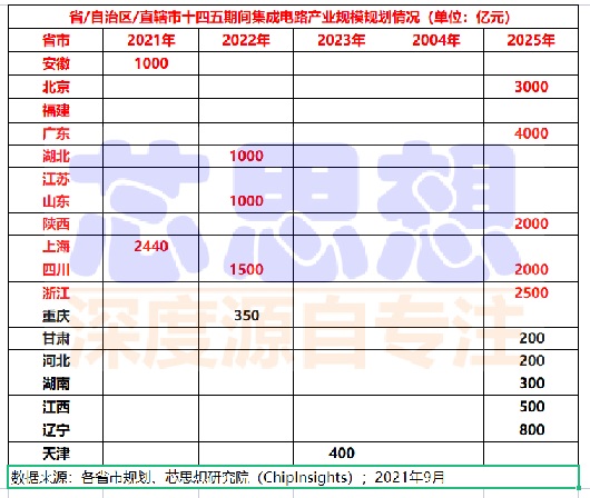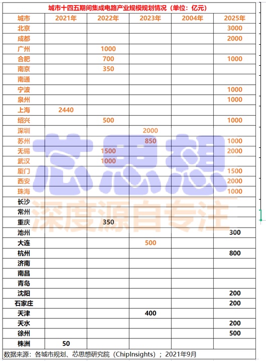 芯思想研究院整理了全國省/自治區/直轄市及集成電路發展重要城市的相關集成電路規劃和產業規模目標,以供參考。