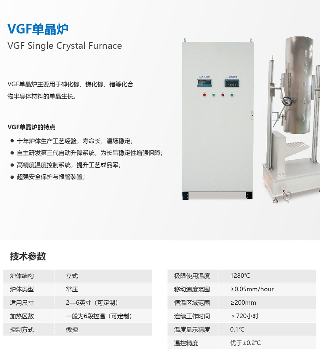 VGF單晶爐主要用于砷化鎵、銻化鎵、鍺等化合物半導(dǎo)體材料的單晶生長(zhǎng)。