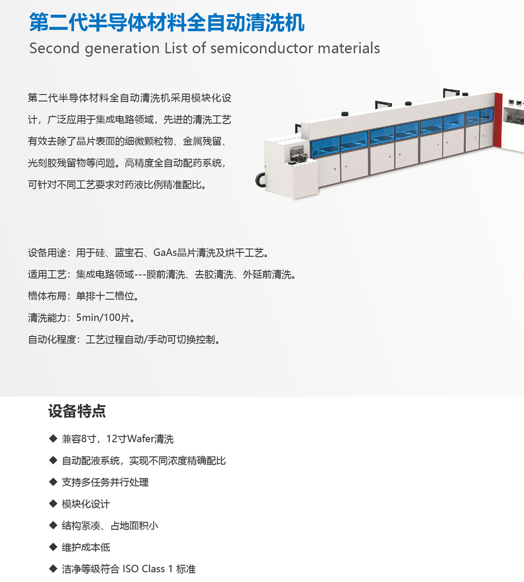 第二代半導體材料全自動清洗機采用模塊化設計,廣泛應用于集成電路領域,先進的清洗工藝有效去除了晶片表面的細微顆粒物、金屬殘留光刻膠殘留物等問題。高精度全自動配藥系統,可針對不同工藝要求對藥液比例精準配比。