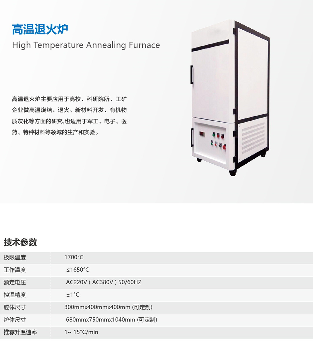 高溫退火爐主要應(yīng)用于高校、科研院所、工礦企業(yè)做高溫?zé)Y(jié)、退火、新材料開發(fā)、有機物質(zhì)灰化等方面的研究,也適用于軍工、電子、醫(yī)藥、特種材料等領(lǐng)域的生產(chǎn)和實驗。