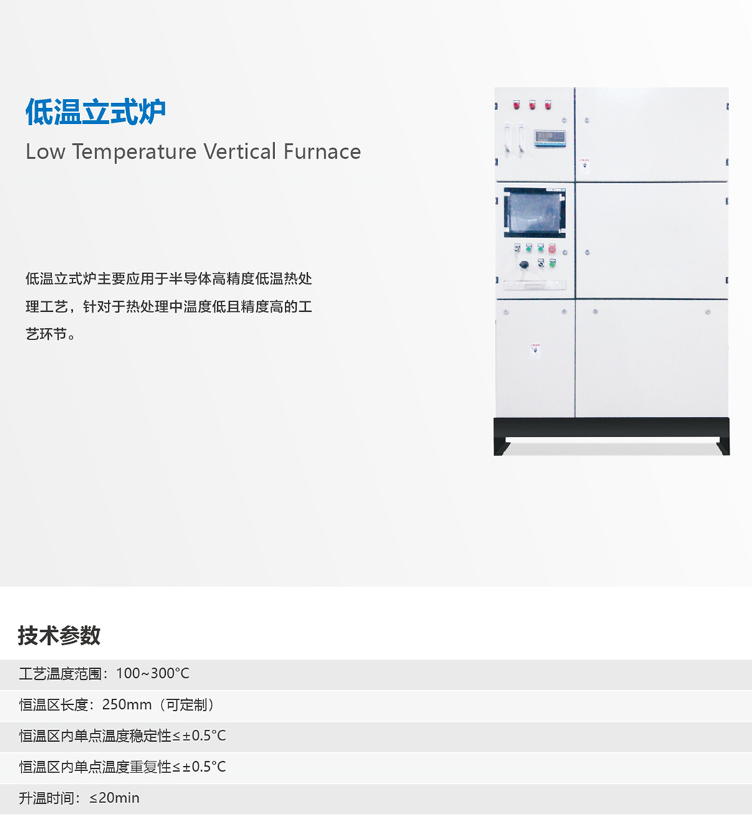 低溫立式爐主要應用于半導體高精度低溫熱處理工藝,針對于熱處理中溫度低且精度高的工藝環節。