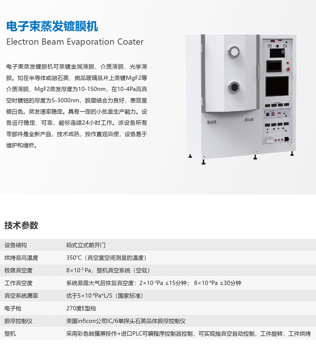 電子?xùn)|蒸發(fā)鍍膜機(jī)可蒸鍍金屬薄膜、介質(zhì)薄膜、光學(xué)薄膜。