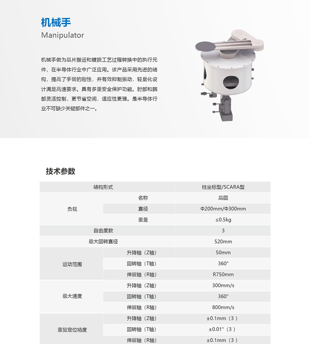 機械手做為晶片搬運和鍍膜工藝過程轉換中的執行元件,在半導體行業中廣泛應用。