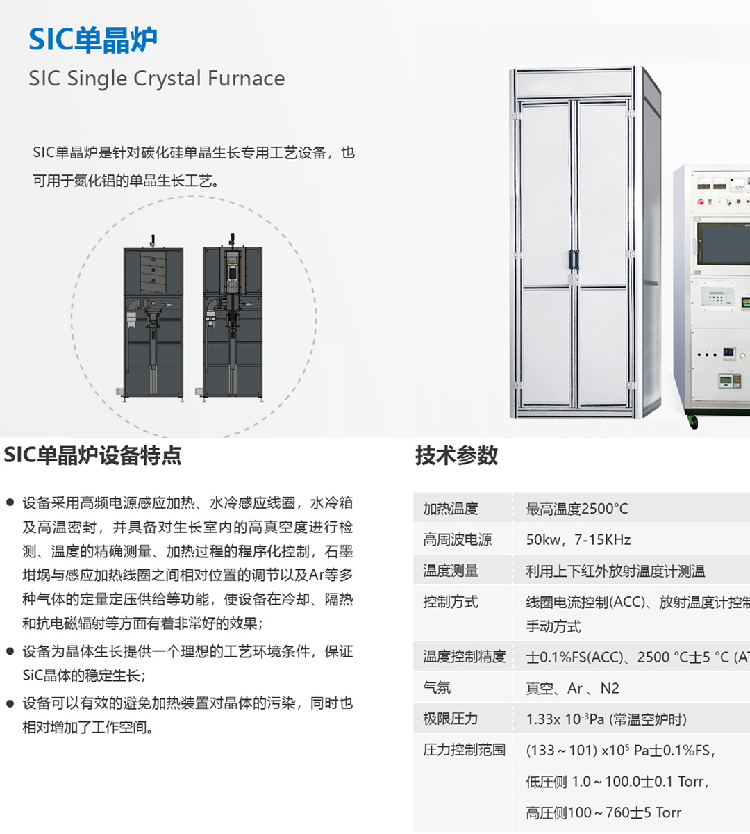 SIC單晶爐是針對碳化硅單晶生長專用工藝設備,也可用于氮化鋁的單品生長工藝。