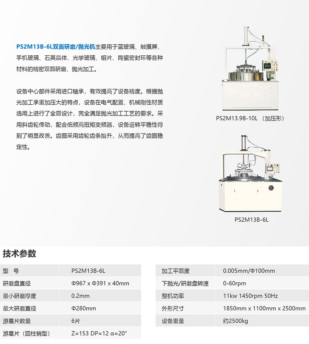 主要用于藍玻璃、觸摸屏、手機玻璃、石英晶體、光學玻璃、鉬片、陶瓷密封環等各種材料的精密雙面研磨、拋光加工設備中心部件采用進口軸承,有效提高了設備精度。