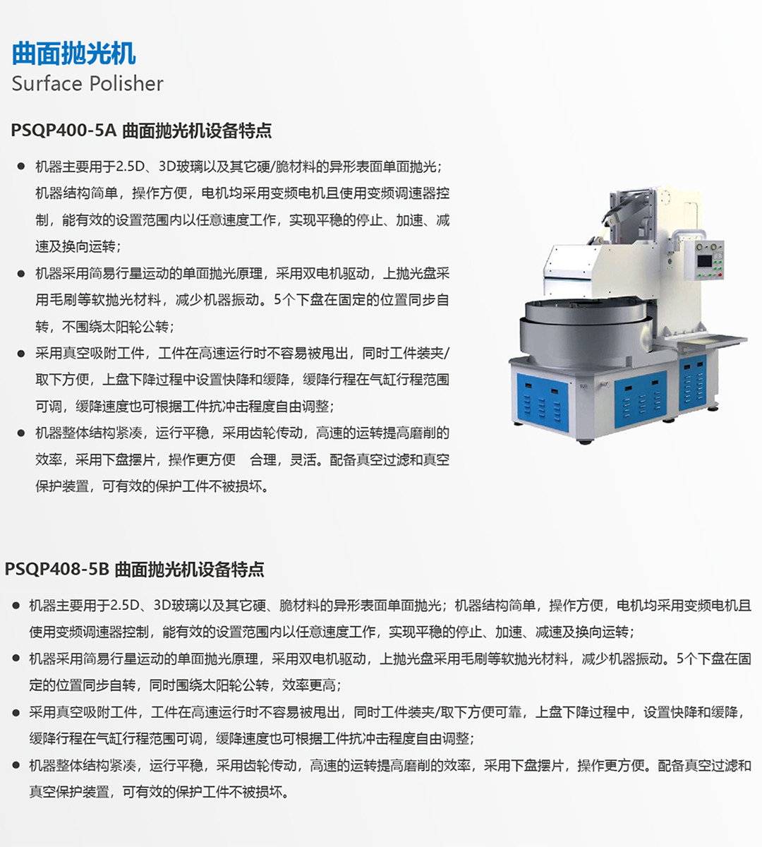 機器主要用于2.5D、3D玻璃以及其它硬、脆材料的異形表面單面拋光;